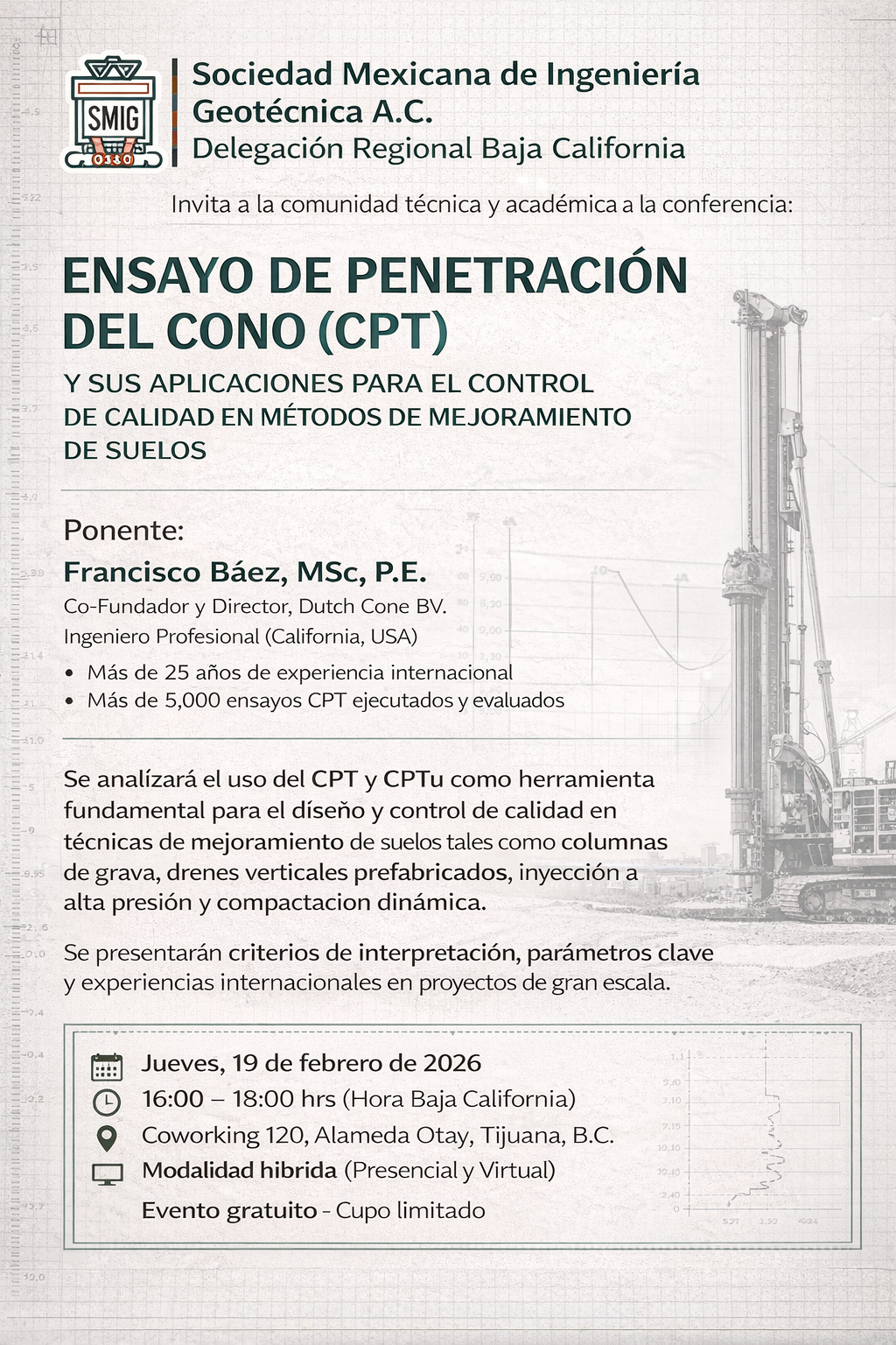 Conferencia Ensayo de penetración del cono (CPT) y sus aplicaciones para el control de calidad en métodos de mejoramiento de suelos Conferencia Ensayo de penetración del cono (CPT) y sus aplicaciones para el control de calidad en métodos de mejoramiento de suelos ----- 19 de Febrero Coworking, Alameda Otay, Tijuana, Baja California Ver video
